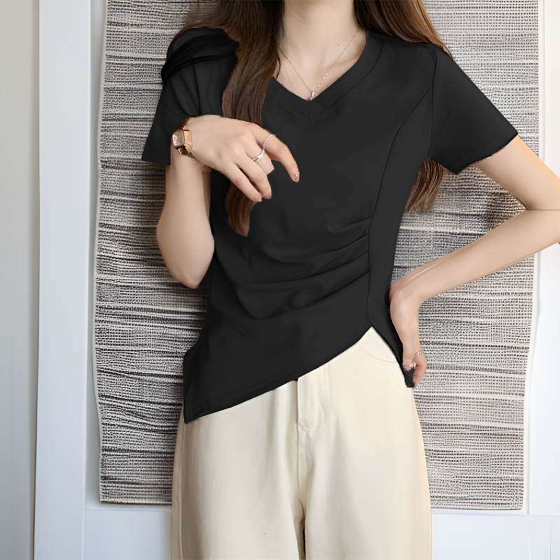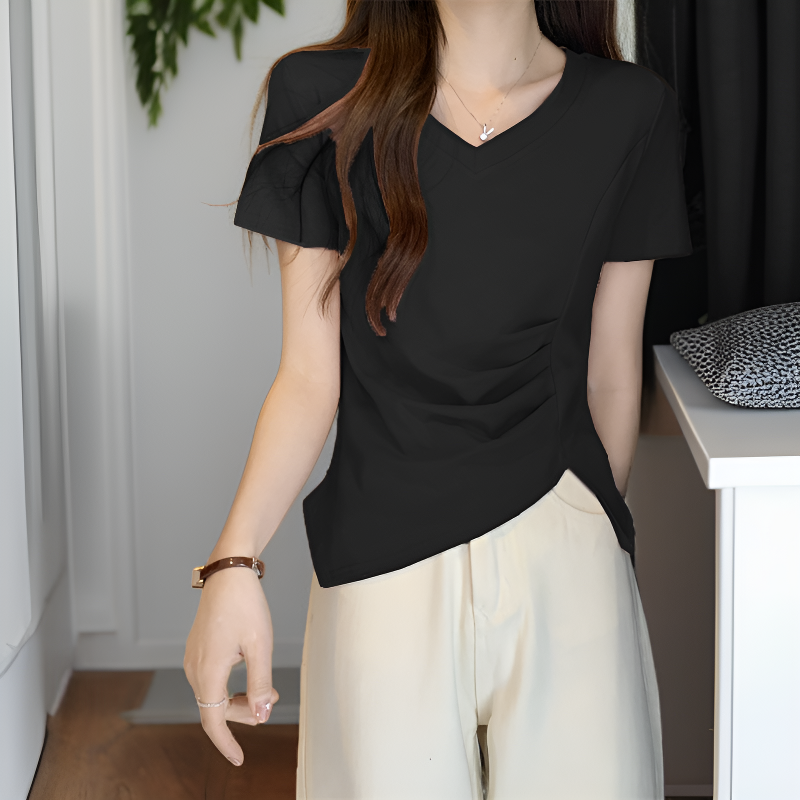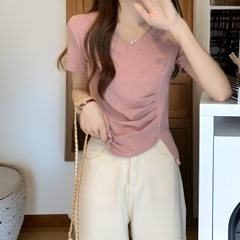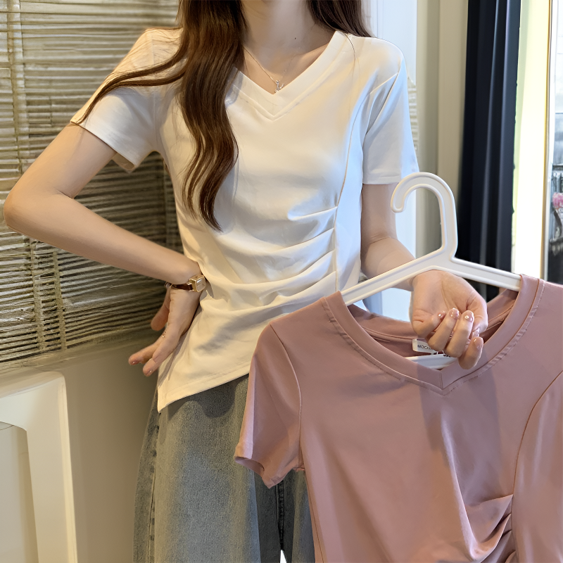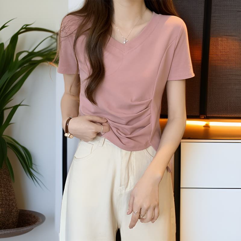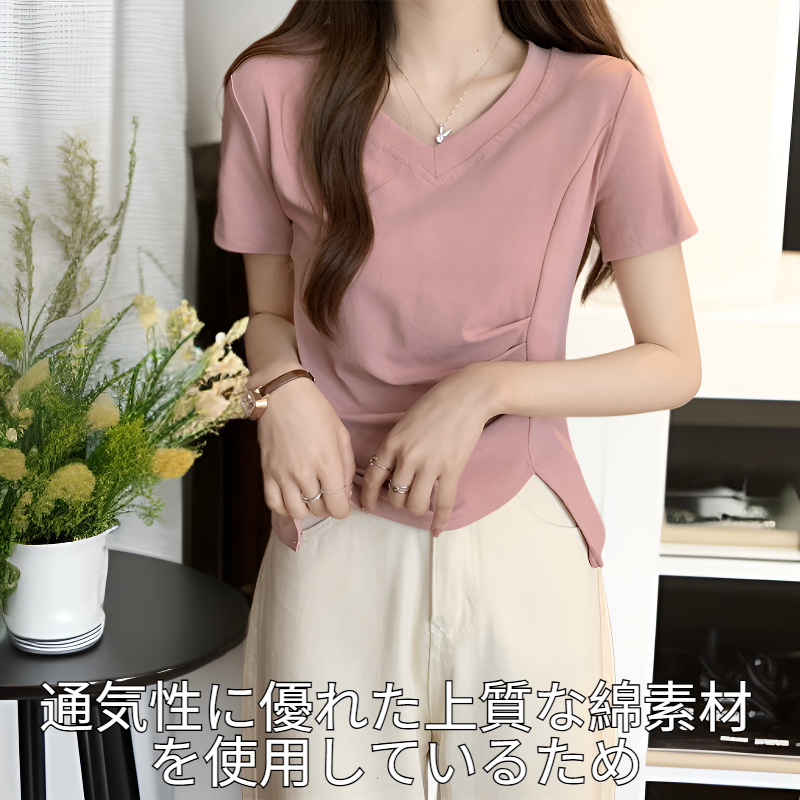 夏の新作ベーシックVネックウエストスリット綿半袖Tブラウス